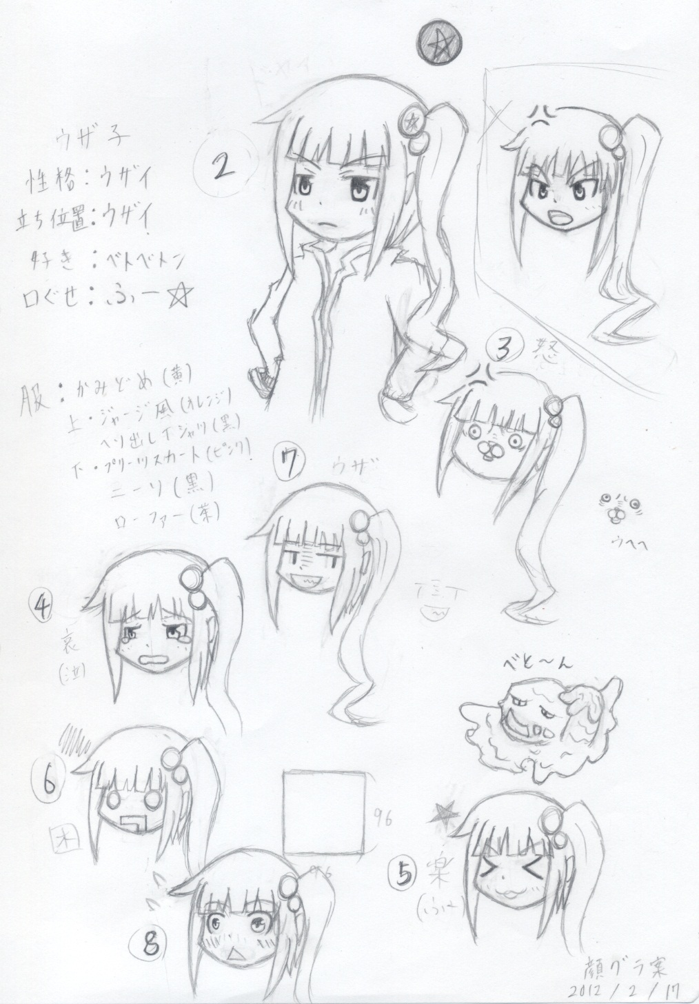 左から、顔グラ(線のみ)、顔グラ(適当に色付け)、表情模索 の3つ。